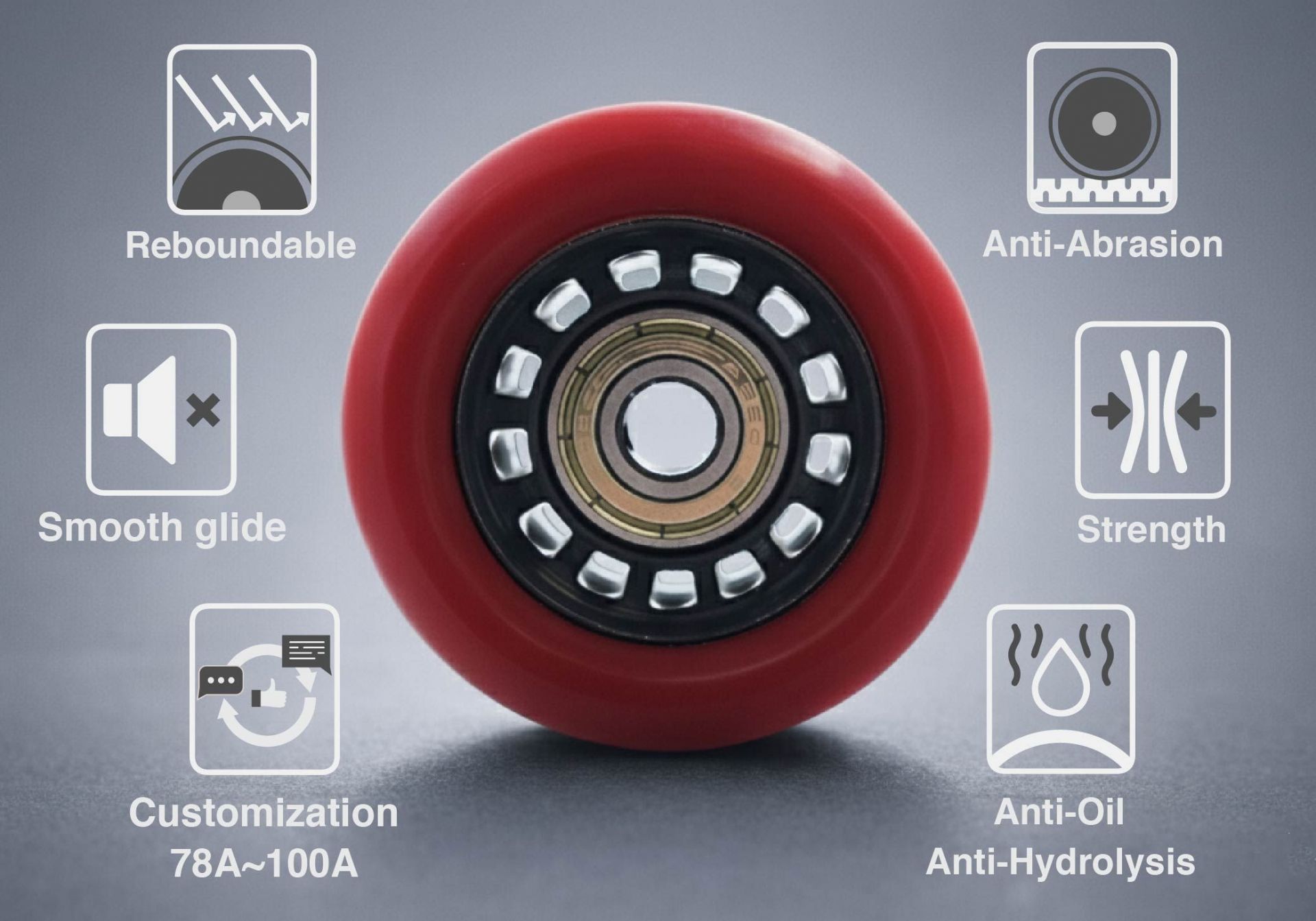 PU cast wheels can be engineered to achieve 360-degree rotation, enhancing maneuverability and steering flexibility. This design allows for smoother, more effortless operation and movement. Common applications include freestyle inline skates and adjustable roller skate wheels, delivering stable and smooth rolling performance.