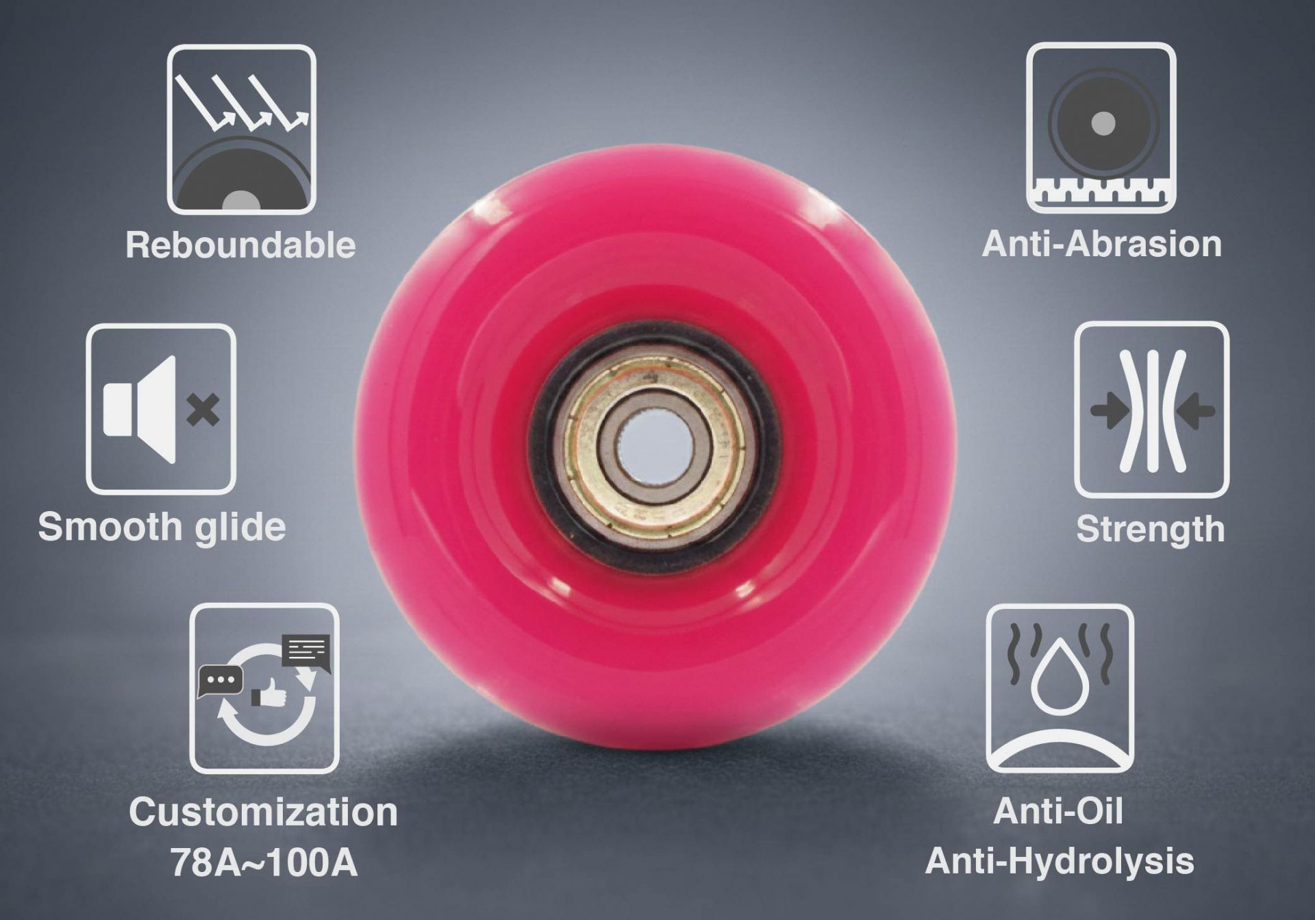 1. Wheel made of casting molded PU material with excellent oil resistance, hydrolysis resistance, and wear resistance. |