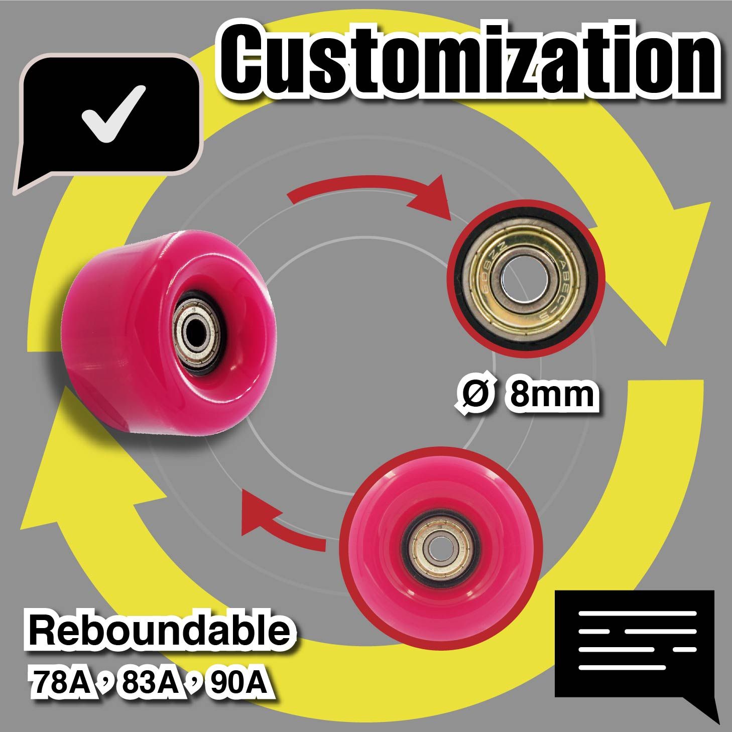 PU cast wheels can be engineered to achieve 360-degree rotation, enhancing maneuverability and steering flexibility. This design allows for smoother, more effortless operation and movement. Common applications include freestyle inline skates and adjustable roller skate wheels, delivering stable and smooth rolling performance.