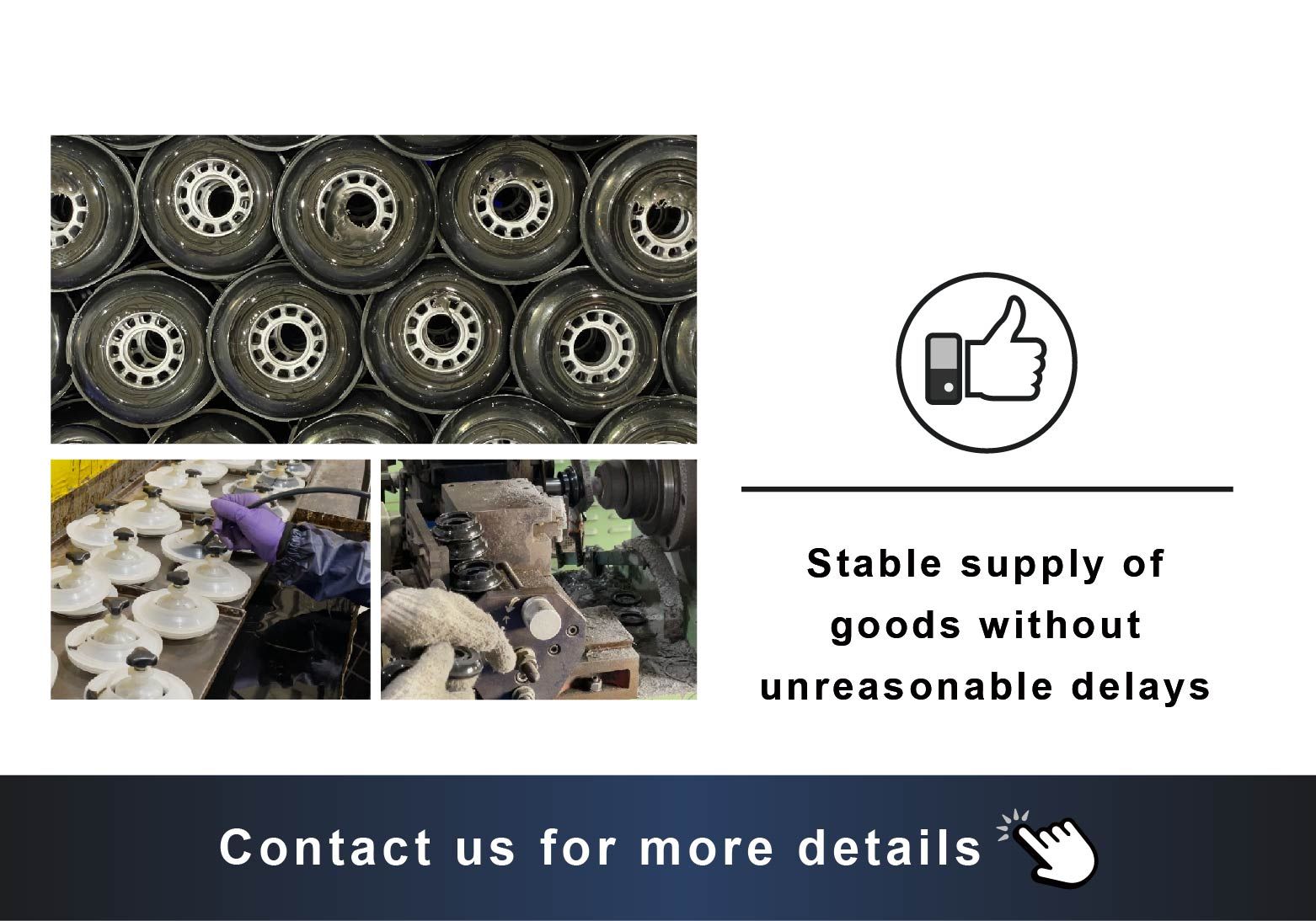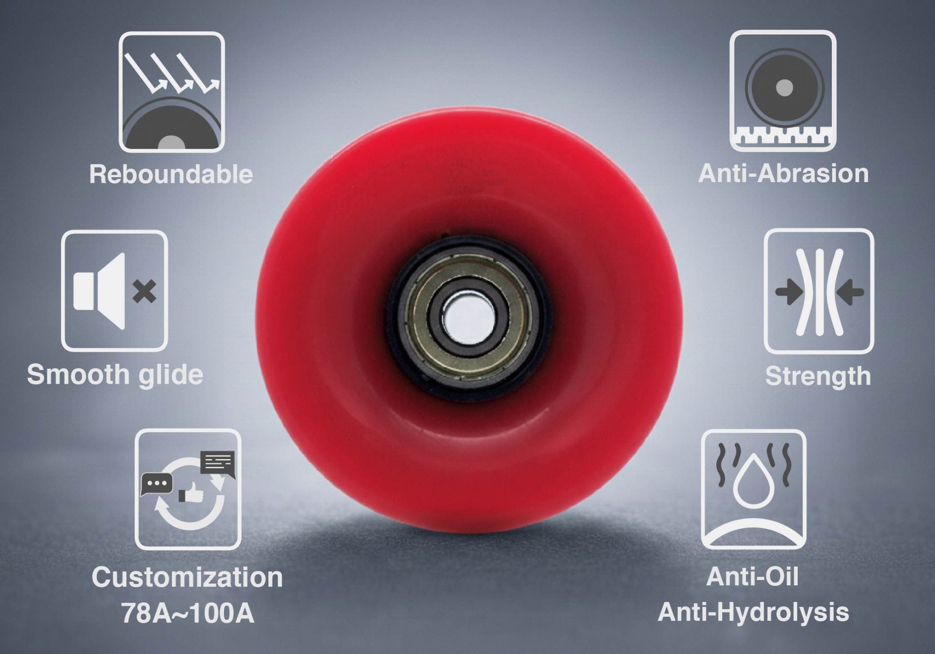 1. Wheel made of casting molded PU material with excellent oil resistance, hydrolysis resistance, and wear resistance. |