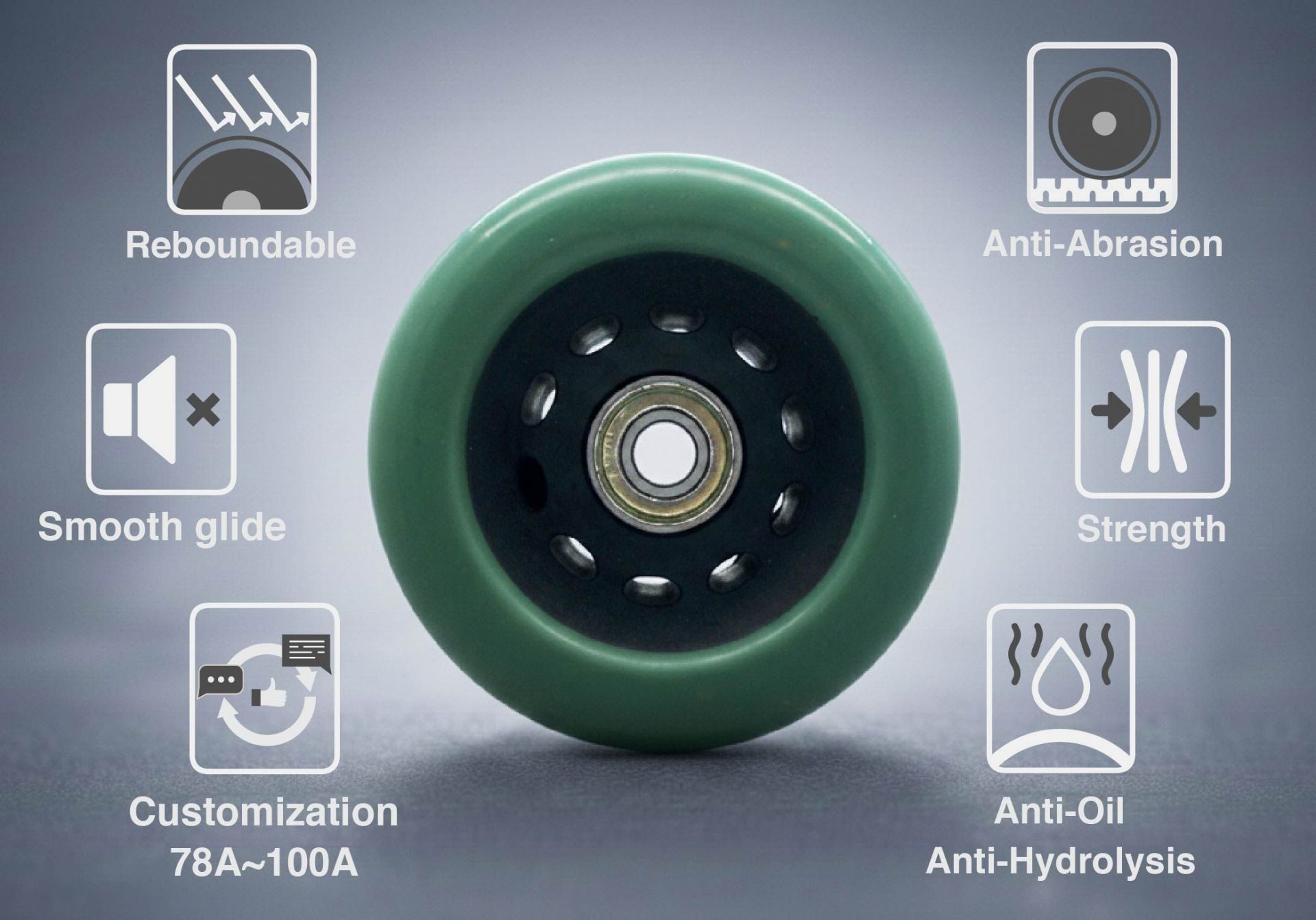 1. Wheel made of casting molded PU material with excellent oil resistance, hydrolysis resistance, and wear resistance. |