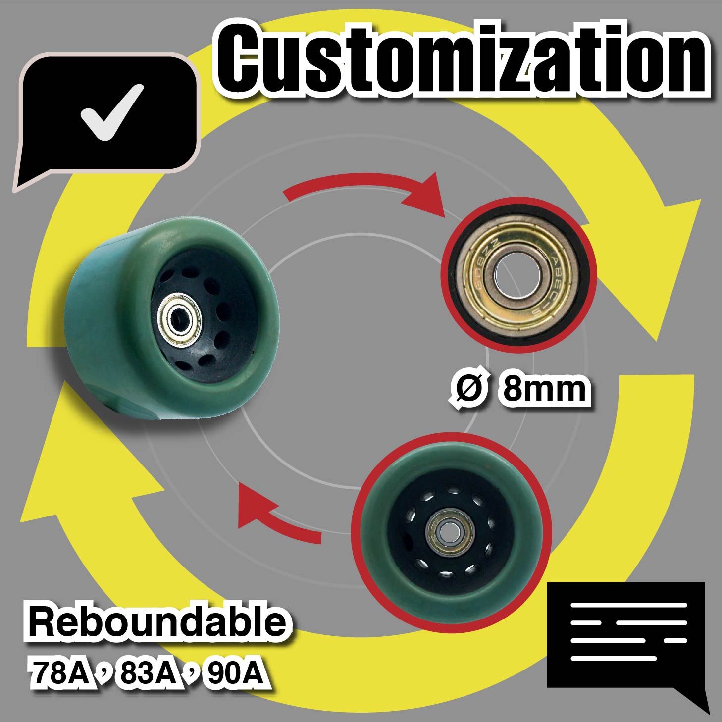 PU cast wheels can be engineered to achieve 360-degree rotation, enhancing maneuverability and steering flexibility. This design allows for smoother, more effortless operation and movement. Common applications include freestyle inline skates and adjustable roller skate wheels, delivering stable and smooth rolling performance.