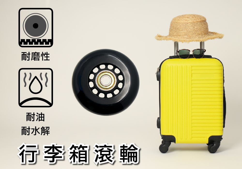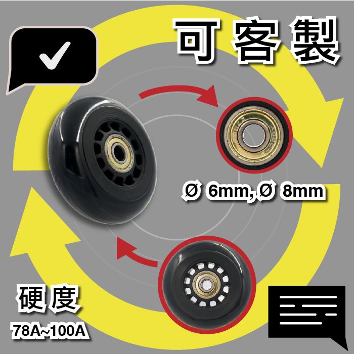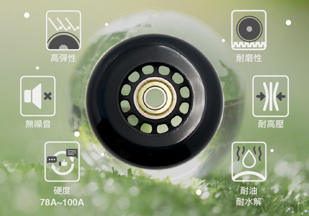 | 產品應用 | 直排輪鞋、四輪溜冰鞋、滑板、滑板車、運動器材、辦公椅活動輪、行李箱輪子。包包、手提箱、購物車、旅行袋 |