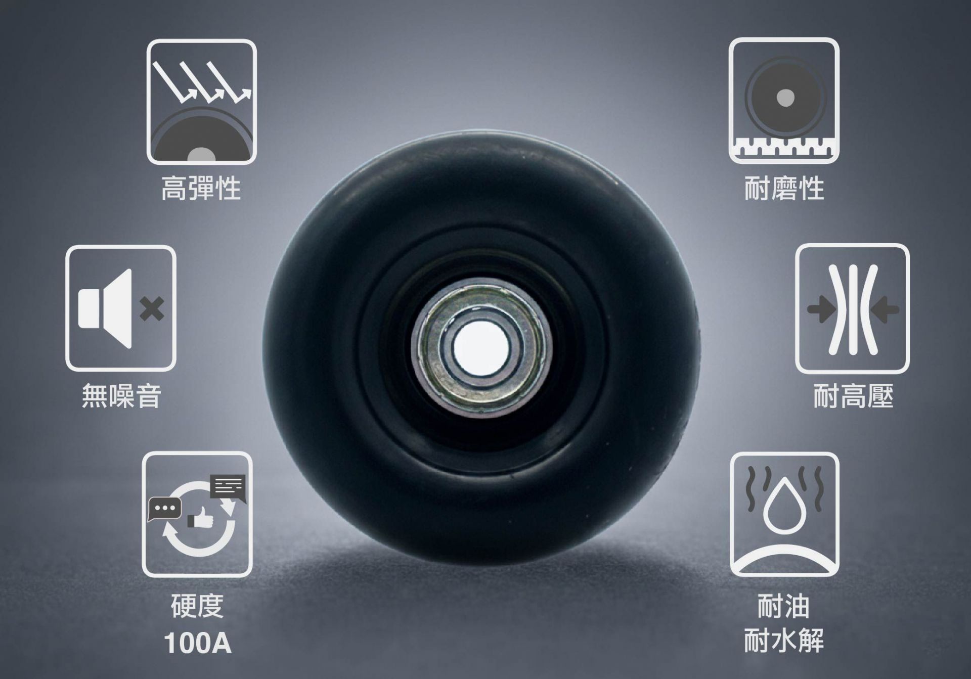1. 為灌注型PU材質,具有出色的耐水解、耐磨損的特性,使得輪子能夠承受長期的使用和摩擦。