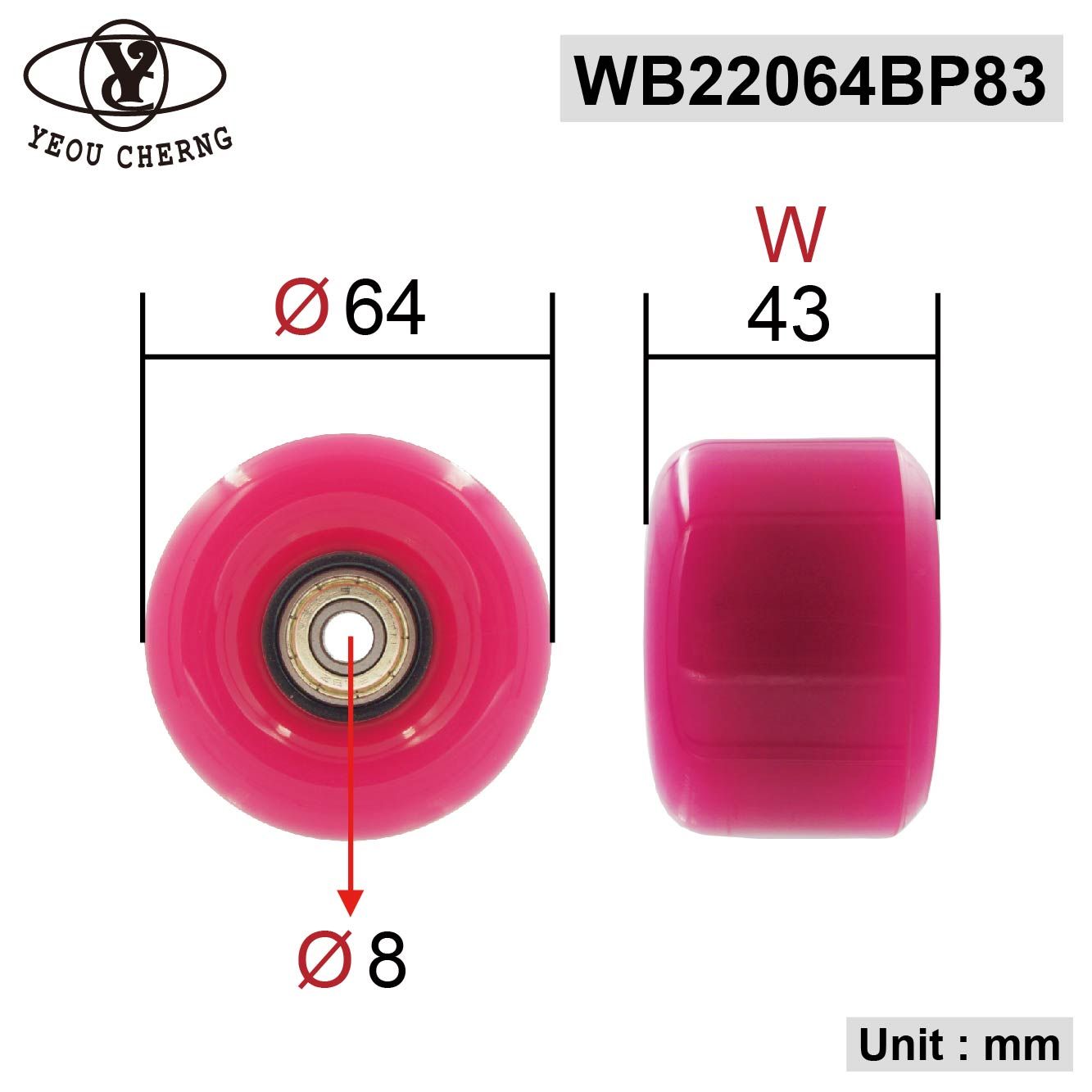 5. 64 x 43 mm 滑板輪,桃紅色PU外皮