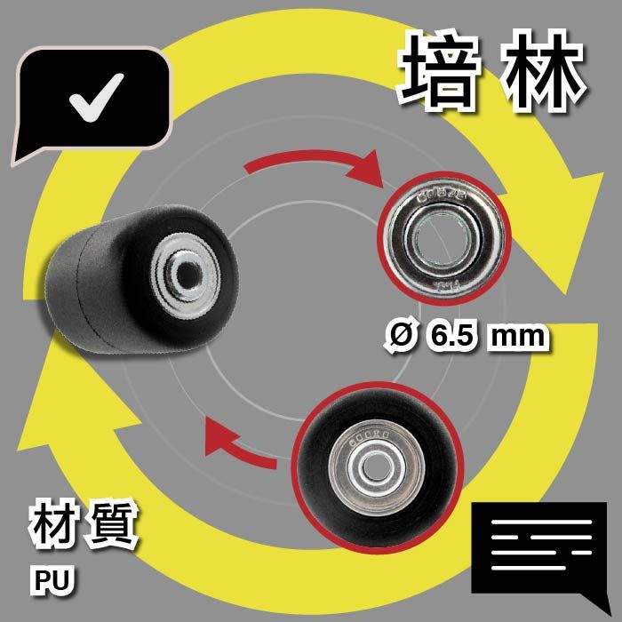 | 產品說明 | 1. 行李箱輪子,PU輪,旅行箱輪,拉桿箱輪子 。 2. 直徑37mm 桶狀寬面輪。 3. 材質: PU 外皮,尼龍內扣,培林輪。 4. 適合用於行李箱維修。 5. 另有多種尺寸可供選擇。 6. 可單獨採購輪釘或培林。 |